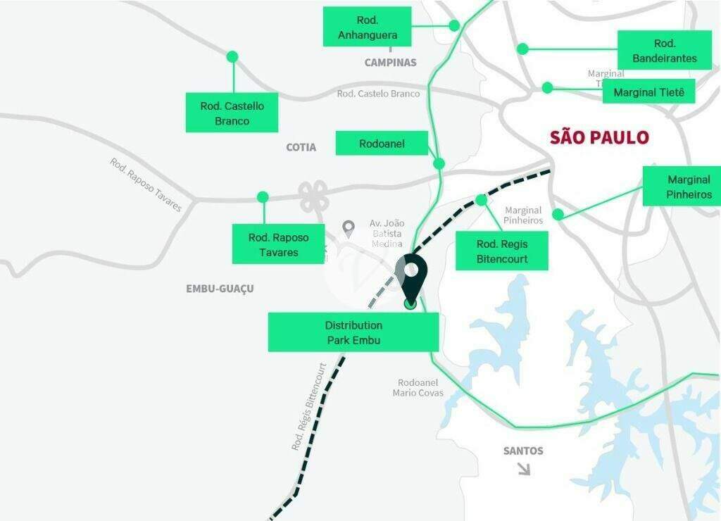 Galpão com 32.000 m² para alugar em Embu das Artes.O empreendimento conta com as melhores especificações técnicas para a alta produtividade de nossos inquilinos com o menor custo de manutenção e operações, 4,0 km do Rodoanel, 0,8 km da Regis Bittencourt. Acesso rápido e eficiente às 10 rodovias que acessam São Paulo. Acesso fácil a São Paulo, ao Porto de Santos e aos aeroportos de Guarulhos e Viracopos. Pedágio Isento.Galpões monousuários com portaria exclusiva;Área total construída: 32.930,00 m²Área total de armazenagem: 30.158,00 m²Mezanino com 1.717,00 m²;69 docas com niveladoras;Pé-direito livre de 12 metros;Espaçamento entre pilares 22,5 x 22,5 metros;Capacidade do piso de 06 ton/m²;Vagas para carretas: 49;Vagas para carro: 70;Docas com niveladoras;Marquise de 6 metros;Fechamento lateral telha e concreto pré-fabricado;Proteção contra incêndio Sprinklers J4;;Cobertura telha zipada e manta FacefeltIluminação LED lux e zenital;Valor de locação: R$ 970.000,00Valor de IPTU: ISENTOConsulte a disponibilidade do empreendimentoCom 19 anos de experiência no setor imobiliário, a Vianna Imobiliária é uma referência consolidada no Grande ABC. Especializados em compra, venda, aluguel e administração de imóveis.Nossa missão é oferecer um atendimento ágil e de qualidade, simplificando processos e assegurando a segurança jurídica em cada negociação.