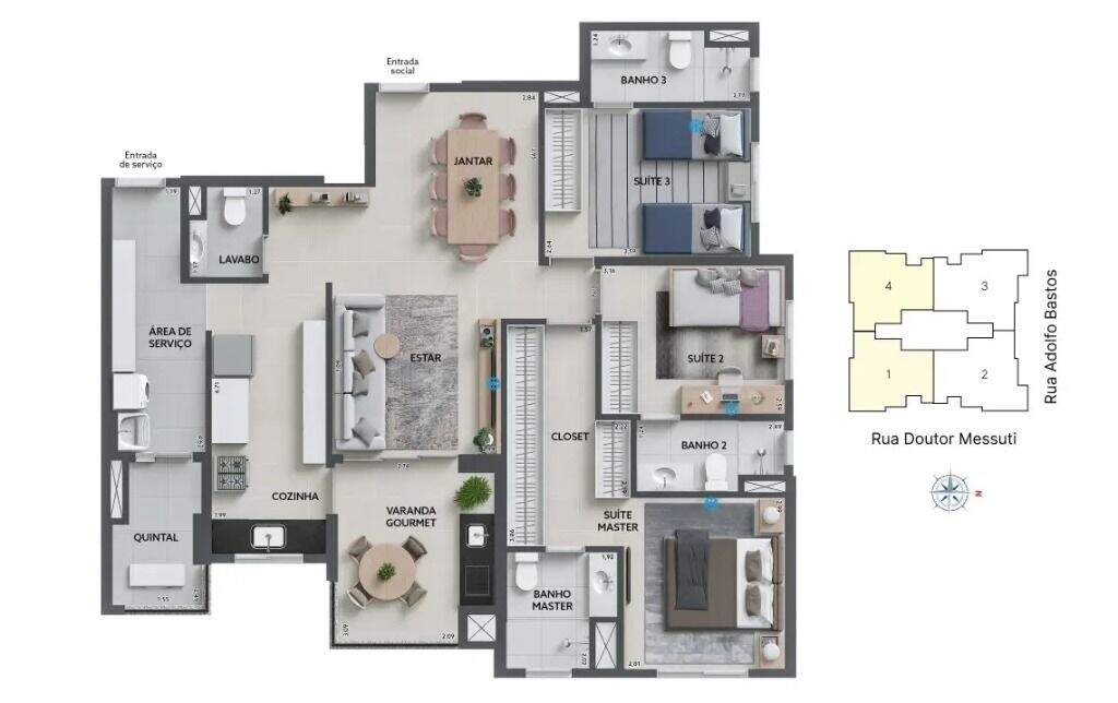 3 suítes amplas, sendo a principal com sacada privativa e fechamento em vidro, garantindo privacidade, conforto acústico e ótima iluminação natural.